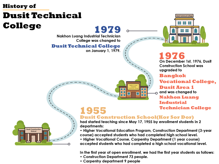 On December 1st, 1976, Dusit Construction School was upgraded to "Bangkok Vocational College, Dusit Area 1" and was changed to "Nakhon Luang Industrial Technician College" and then was changed to Dusit Technical College on January 1, 1979.